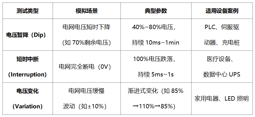依據(jù)IEC61000-4系列標(biāo)準(zhǔn)的要求,主要測(cè)試以下三種電網(wǎng)異常情況: