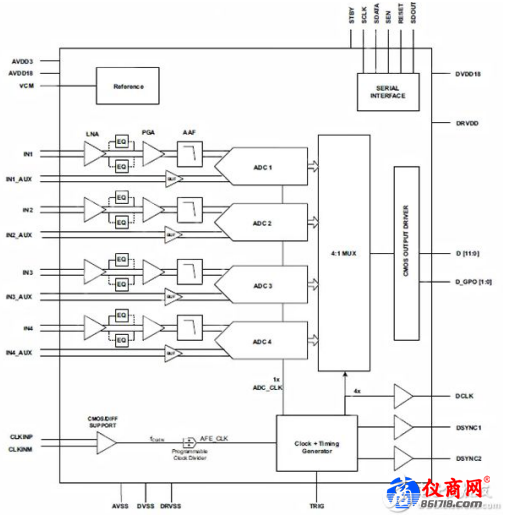 此領(lǐng)域所使用的元器件可能包括 Texas Instruments AFE5401TRGCTQ1 等零件。 這是一款單片式 4 通道模擬雷達前端,配有集成式低噪聲放大器、均衡器、可編程增益放大器、抗混疊以及帶有 12 位分辨率的 A/D(圖 3)。 特別有趣的是,該額定電壓為 1.8 伏的零件允許在所有通道同步采樣,并且采樣速率高達每秒 2500 萬個樣本,另外,12 位的兼容并行總線可將采集到的數(shù)據(jù)快速傳輸?shù)奖镜刂鳈C控制器。