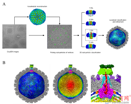 利用冷凍電鏡解析生物大分子的原子分辨率三維結(jié)構(gòu)已成常態(tài),然而對于皰疹病毒基因組結(jié)構(gòu)以及包裝基因組的分子機器(即DNA通道)的結(jié)構(gòu)解析仍舊需要克服諸多困難,例如:1、皰疹病毒顆粒具有巨大的直徑,導(dǎo)致對于每個病毒顆粒來說,只有部分區(qū)域在冷凍電鏡成像時能夠很好地處于成像焦平面,極大限制了結(jié)構(gòu)解析的分辨率。2、通常對皰疹病毒結(jié)構(gòu)的解析采用正二十面體對稱的重構(gòu)方式來獲得高分辨衣殼結(jié)構(gòu),但是DNA通道和基因組不符合二十面體對稱性。3、DNA具有雙螺旋對稱,DNA通道蛋白大致具有十二重對稱性,而病毒頂點的衣殼蛋白具有五重對稱性,這種偶聯(lián)的對稱性不匹配極大地增加了結(jié)構(gòu)解析的復(fù)雜度。