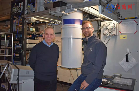 圖丨Michel Devoret (左) 與其學(xué)生 Zlatko Minev(右)在實(shí)驗(yàn)所用的低溫恒溫器前的合影。(來(lái)源:Yale Quantum Institute)