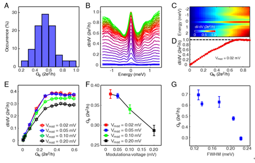 已有的實(shí)驗(yàn)提供了馬約拉納零能模存在的大量實(shí)驗(yàn)證據(jù),也解釋了馬約拉納零能模存在的微觀物理機(jī)制,但是在新奇物理現(xiàn)象豐富的凝聚態(tài)材料中,仍然需要更強(qiáng)有力的實(shí)驗(yàn)證據(jù)證明零能模信號來源于馬約拉納準(zhǔn)粒子,例如,量子化電導(dǎo)平臺的實(shí)驗(yàn)觀測。在固體材料體系中,激發(fā)得到的馬約拉納準(zhǔn)粒子具有本征的粒子-反粒子對稱性,其電子與空穴的組成成分相等。在超導(dǎo)體材料的測量中,一個(gè)入射的電子必然會帶來一個(gè)反射的空穴。超導(dǎo)體表面馬約拉納零能模的出現(xiàn)使得電子與空穴的隧穿概率相等并發(fā)生Andreev共振反射,產(chǎn)生獨(dú)特的量子化的電導(dǎo)平臺特征。該特征是馬約拉納零能模存在的關(guān)鍵性實(shí)驗(yàn)證據(jù)。