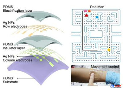 研究人員利用靜電紡絲技術(shù)制備大面積的PVA納米纖維薄膜,隨后獲得Ag納米纖維,其具有優(yōu)良的電導(dǎo)率及透光性(1.68-11.1Ω sq-1,透光率大于70%)。通過(guò)器件設(shè)計(jì),以及微加工以及濕法刻蝕等工藝,制備獲得高透明度、高壓力敏感性、可拉伸性觸覺(jué)傳感器。該方法操作簡(jiǎn)單、成本較低,且易于大規(guī)模制備。研究人員探索了不同取向的Ag納米纖維對(duì)器件的拉伸性能,解釋了器件在拉伸狀態(tài)下的荷電傳導(dǎo)機(jī)制。實(shí)驗(yàn)發(fā)現(xiàn),其制備的隨機(jī)取向的Ag納米纖維,在100%的拉伸下電阻改變量?jī)H有10%,并可探測(cè)低至4.4Pa的壓力且具有約70ms的響應(yīng)時(shí)間。另外,通過(guò)采用優(yōu)化的交叉陣列結(jié)構(gòu),其8×8的陣列觸覺(jué)傳感器可實(shí)現(xiàn)不規(guī)則平面的實(shí)時(shí)軌跡探測(cè)。該類器件具有廣闊的市場(chǎng)前景,在人機(jī)交互、自驅(qū)動(dòng)機(jī)器人、柔性顯示屏和可穿戴電子設(shè)備中有潛在的應(yīng)用價(jià)值。