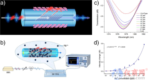 圖.a):黑磷傾斜光纖光柵器件及其光學(xué)調(diào)制示意圖,b):重金屬離子檢測(cè)的實(shí)驗(yàn)步驟,c):不同重金屬離子濃度下TM模式共振的光譜圖,d):不同重金屬離子濃度下光譜的共振強(qiáng)度圖