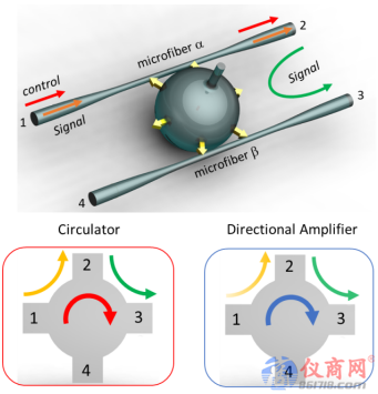 據(jù)悉,2016年該研究組實(shí)驗(yàn)驗(yàn)證了回音壁模式微腔中腔光力的非互易特性[Nature Photonics 10, 657-661 (2016)]。在此基礎(chǔ)上,研究組利用單個(gè)光力微腔與雙波導(dǎo)耦合的體系,實(shí)現(xiàn)了多功能的光子器件,包括窄帶濾波器,具有非互易功能的四端口光環(huán)形器與定向放大器,并且這些功能模式可以通過(guò)改變控制光來(lái)實(shí)現(xiàn)任意切換。對(duì)于環(huán)形器而言,從端口1入射的信號(hào)光從端口2出射,從端口2入射的信號(hào)光從端口3出射,依此類推,構(gòu)成1-2-3-4-1的環(huán)形路徑,當(dāng)只關(guān)注端口1和2時(shí),它也是一個(gè)高效的光隔離器;對(duì)于定向放大器,從端口1入射的信號(hào)光被放大后從端口2出射,但從端口2入射的信號(hào)光從端口3出射,而不會(huì)從端口1出射,因此在1-2的方向上具有定向放大的功能。該器件結(jié)構(gòu)簡(jiǎn)單,原理具有普適性,甚至可實(shí)現(xiàn)單光子水平的光環(huán)形器,同時(shí)可推廣到任一具有行波模式的光力學(xué)體系,包括微波超導(dǎo)器件和集成聲學(xué)器件。