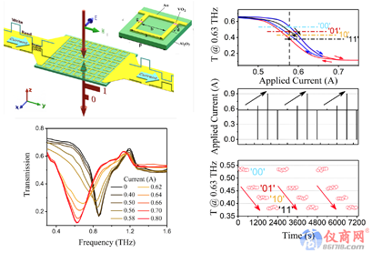 另外,當(dāng)前研究的太赫茲主動調(diào)控器件功能比較單一,即只能在單一外場下實現(xiàn)單一的功能。但單一功能難以適應(yīng)當(dāng)今技術(shù)發(fā)展的要求。因此,在單一器件上,實現(xiàn)多物理場的調(diào)控,并實現(xiàn)對太赫茲波的多功能調(diào)控,是當(dāng)前太赫茲技術(shù)的發(fā)展前沿之一,也是實際應(yīng)用的現(xiàn)實需求。有鑒于此,該團(tuán)隊基于VO2的絕緣-金屬相變,通過將VO2與金屬非對稱開口諧振環(huán)結(jié)合,設(shè)計了一種太赫茲波段的多功能可調(diào)諧復(fù)合超表面,并利用國家同步輻射實驗室副研究員鄒崇文提供的高質(zhì)量VO2薄膜,通過刻蝕、光刻等工藝制備了器件。此復(fù)合超表面能夠通過加熱和施加電流的方式實現(xiàn)對透射太赫茲波的振幅調(diào)控,絕對調(diào)制深度高達(dá)54%,品質(zhì)因數(shù)高達(dá)138%?;赩O2在相變過程中的回滯特性,該復(fù)合超表面可以通過電流觸發(fā)實現(xiàn)室溫下對太赫茲波的記憶存儲功能。此外,利用超快強脈沖泵浦,此復(fù)合超表面還能實現(xiàn)對太赫茲波的超快調(diào)控。從而,在單一器件實現(xiàn)了對太赫茲波的多功能調(diào)控。相關(guān)研究成果近日在《先進(jìn)光學(xué)材料》期刊上線[Adv. Optical Mater. 2018, DOI: 10.1002/adom.201800257]。