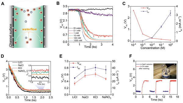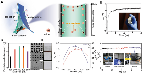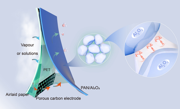 由于構(gòu)成水伏器件的功能化納米材料間缺乏有效的綁定機(jī)制,嚴(yán)重制約了蒸發(fā)驅(qū)動(dòng)的水伏效應(yīng)在可穿戴傳感電子領(lǐng)域的應(yīng)用。在不犧牲納米通道結(jié)構(gòu)和表面功能特性的前提下,顯著提高水伏器件的機(jī)械強(qiáng)度和柔性以滿足可穿戴需求是實(shí)現(xiàn)水伏效應(yīng)在可穿戴電子領(lǐng)域廣泛應(yīng)用所面臨的重大挑戰(zhàn)之一。另一方面,基于具有交疊雙電層納米通道的水伏器件在產(chǎn)電之外還具有離子傳感的潛力,然而目前研究大多都聚焦于水伏產(chǎn)電性能的提升,水伏離子傳感卻被忽視。