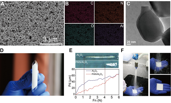 圖2. 柔性強(qiáng)韌PAN/Al2O3水伏薄膜的結(jié)構(gòu)及其結(jié)構(gòu)強(qiáng)度表征