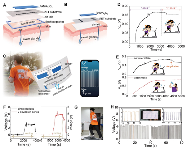 近期,中科院蘇州納米所張珽研究員團(tuán)隊(duì)報(bào)道了一種用于柔性可穿戴電子的強(qiáng)韌水伏離子傳感器。利用高分子聚丙烯腈(PAN)對(duì)氧化鋁(Al2O3)納米顆粒進(jìn)行強(qiáng)力的串聯(lián)和綁定(圖1,圖2A-C),使其形成的多孔薄膜具有出色的柔性和機(jī)械抗沖擊特性,可以經(jīng)受超過(guò)180°的彎曲和9.92 m s-1的高速水流沖擊(圖2D-F)。更為重要的是,PAN結(jié)構(gòu)穩(wěn)定機(jī)制的引入也未對(duì)Al2O3形成的納米通道結(jié)構(gòu)和表面Zeta電位造成限制?;谠撊嵝詮?qiáng)韌PAN/Al2O3薄膜的水伏離子傳感器件展現(xiàn)了高達(dá)3.18 V的最大開(kāi)路電壓(去離子水中)(圖3)和10-4-100 M的離子濃度傳感范圍(圖4)。進(jìn)一步,通過(guò)接觸和非接觸式水分收集器件結(jié)構(gòu)設(shè)計(jì),成功的將其應(yīng)用于可穿戴多功能傳感器供能和自驅(qū)動(dòng)汗液電解質(zhì)傳感器的構(gòu)建,實(shí)現(xiàn)了基于水伏效應(yīng)的運(yùn)動(dòng)健康監(jiān)測(cè)(圖5)。該項(xiàng)研究工作突破了傳統(tǒng)水伏器件中功能化納米顆粒組裝中的機(jī)械脆性限制,并同時(shí)實(shí)現(xiàn)了高性能水伏產(chǎn)能和水伏離子傳感,為蒸發(fā)驅(qū)動(dòng)的水伏效應(yīng)應(yīng)用于可穿戴傳感領(lǐng)域提出了創(chuàng)新思路。該工作以A flexible tough hydrovoltaic coating for wearable sensing electronics為題發(fā)表在Advanced Materials上。文章第一作者是中科院蘇州納米所副研究員李連輝和碩士研究生鄭卓,通訊作者為張珽研究員。該研究得到了國(guó)家自然科學(xué)基金的支持。