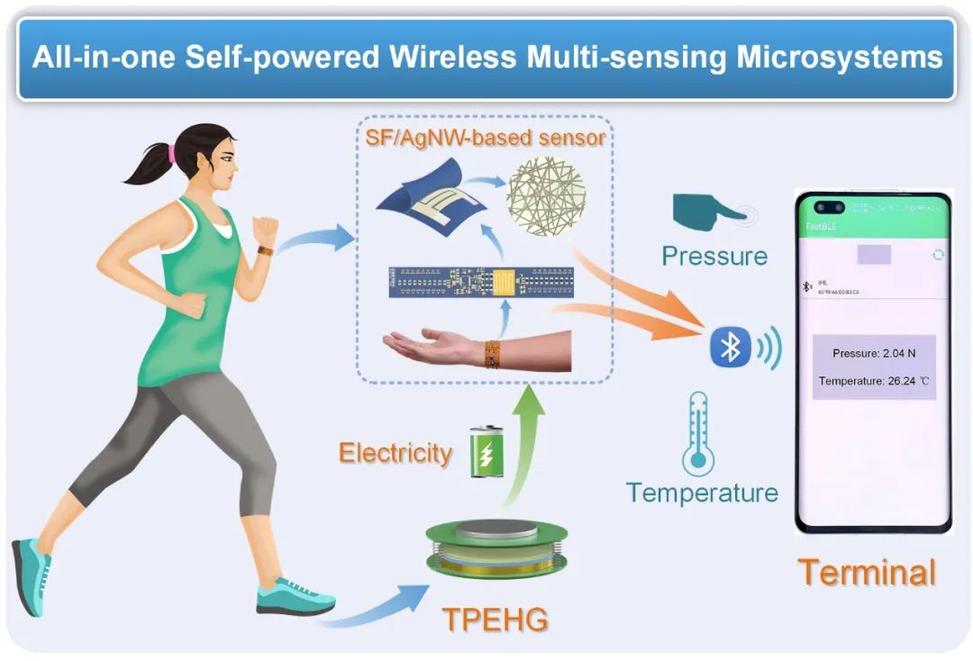 該工作研發(fā)了一種基于蠶絲蛋白/銀納米線復(fù)合材料的柔性多傳感融合感知器件,并集成了基于三種機(jī)理耦合的高性能復(fù)合微納能源器件,開發(fā)了基于電容陣列優(yōu)化模型的電源管理電路,進(jìn)而構(gòu)建了一種全集成的自供能無線多傳感智能微系統(tǒng)。研究生文丹良和黃鵬為論文共同第一作者,張曉升教授為論文通訊作者,電子科技大學(xué)為論文唯一作者單位。