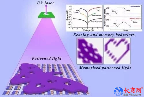 為實(shí)現(xiàn)集成電子器件對于光線信息的探測和記憶功能,研究團(tuán)隊(duì)中的博士生陳帥和助理研究員婁正,合作開發(fā)出一種仿生的柔性人工視覺感知與存儲系統(tǒng)。該系統(tǒng)集成了一種基于氧化銦半導(dǎo)體微米線陣列的圖像傳感器件與一種基于原子層沉積的氧化鋁阻變式憶阻器件。通過外界紫外光線的激發(fā),圖像傳感器的電阻狀態(tài)將從高阻態(tài)轉(zhuǎn)變?yōu)榈妥钁B(tài)。當(dāng)其阻值降低到一定值,將使串聯(lián)的憶阻器件兩端的電壓達(dá)到憶阻器的開啟電壓,進(jìn)而激發(fā)憶阻器從高阻態(tài)轉(zhuǎn)換為低阻態(tài),這兩種狀態(tài)分別對應(yīng)于邏輯電路中的 off(1)和 on(0)狀態(tài)。這樣,當(dāng)外界的紫外光線消失時(shí),圖像傳感器件將恢復(fù)到初始狀態(tài),但其感知到的光線信息已經(jīng)以二進(jìn)制的形式被存儲在憶阻器中。此外,通過擴(kuò)展器件陣列的像素密度而組裝的10×10視覺存儲陣列器件,能夠?qū)崿F(xiàn)對于外界圖像式光線分布的感知與存儲功能。該人工系統(tǒng)展現(xiàn)出長期的信息記憶功能,能夠穩(wěn)定記憶長達(dá)一周以上。通過在憶阻器兩端施加一負(fù)向電壓,可擦除掉已存儲的光線分布信息,并再次存儲其他圖像的光線分布信息,從而實(shí)現(xiàn)集成器件的可重復(fù)利用性。