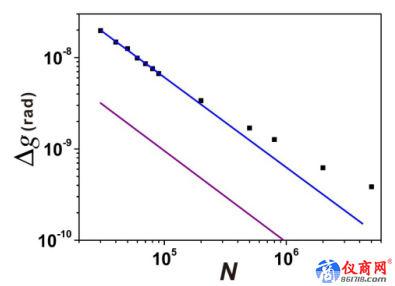 圖2.實(shí)驗(yàn)結(jié)果:在光子數(shù)小于十萬時(shí)測量精度反比于光子數(shù),達(dá)到海森堡極限
