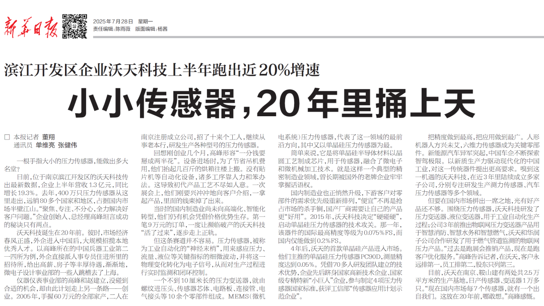 一根手指大小的壓力傳感器,能做出多大名堂?日前,位于南京濱江開(kāi)發(fā)區(qū)的沃天科技傳出最新數(shù)據(jù),企業(yè)上半年?duì)I收1.3億元,同比增長(zhǎng)19.3%。去年,400萬(wàn)只壓力傳感器從這里走出,遠(yuǎn)銷80多個(gè)國(guó)家和地區(qū),占據(jù)國(guó)內(nèi)市場(chǎng)半壁江山。“聚焦、專注、不分心,全力解決好客戶問(wèn)題。”企業(yè)創(chuàng)始人、總經(jīng)理高峰坦言成功的秘訣只有兩點(diǎn)。