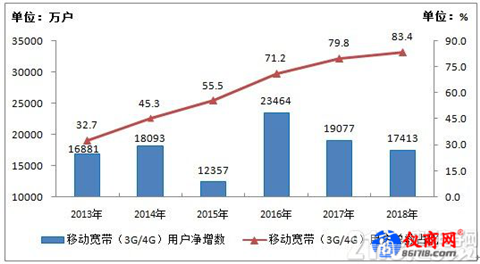 2013-2018年移動(dòng)寬帶(3G/4G)用戶發(fā)展情況