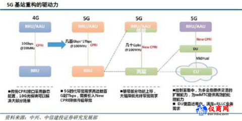 傳統(tǒng)3G/4G基站通常是基帶處理單元(BBU)、射頻拉遠單元(RRU)和天饋系統(tǒng)三者獨立,5G核心網(wǎng)技術(shù)融合后,基站架構(gòu)相較于4G基站將會發(fā)生重大變化:5G基站的BBU功能將被重構(gòu)為CU(中央單元)與DU(分布單元)兩個功能實體,RRU與天線融合為AAU。