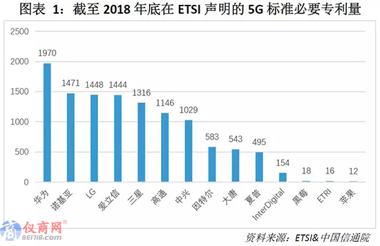目前,5G標(biāo)準(zhǔn)的專利聲明量超過1000項(xiàng)的企業(yè)有華為、諾基亞、LG、愛立信、三星、高通和中興。其中,華為以1970項(xiàng)5G聲明專利排名第一,占比達(dá)16.9%;此外,中興以1029項(xiàng)專利排名第七,占比8.8%;大唐以543項(xiàng)專利排名第九,占比4.7%。中國三家企業(yè)的聲明專利總量3542項(xiàng),占總聲明專利量的30.4%,中國5G研發(fā)處于全球公認(rèn)的領(lǐng)先梯隊(duì)。