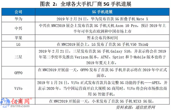 從5G手機(jī)發(fā)布情況來看,各大手機(jī)廠商均在MWC2019前后推出了首款5G手機(jī),國內(nèi)廠商華為、中興、OPPO、ViVo、小米都已發(fā)布了5G手機(jī),并將在2019-2020年陸續(xù)面世。