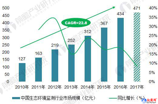 在“十二五”的政策熱潮下,我國(guó)環(huán)境監(jiān)測(cè)行業(yè)發(fā)展迅速,根據(jù)國(guó)家環(huán)境監(jiān)測(cè)總站的數(shù)據(jù),2016年行業(yè)規(guī)模約為434億元,2010-2016年行業(yè)復(fù)合增速達(dá)到22.8%,2017年的市場(chǎng)規(guī)模在471億元左右。然而對(duì)比整個(gè)萬(wàn)億級(jí)的環(huán)保市場(chǎng)而言,環(huán)境監(jiān)測(cè)的市場(chǎng)規(guī)模較小,未來(lái)市場(chǎng)增長(zhǎng)空間巨大。