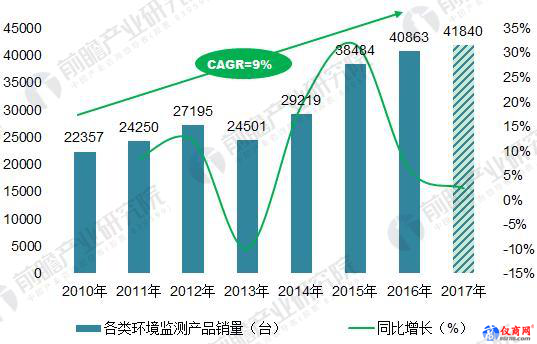 圖表2:2010-2017年中國(guó)環(huán)境監(jiān)測(cè)產(chǎn)品年銷量與增長(zhǎng)率(單位:臺(tái),%)