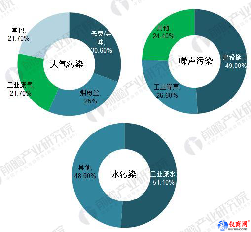 2017年舉報(bào)污染類型占比大氣污染方面,反映惡臭/異味污染最多,占涉氣舉報(bào)的30.6%,其次為反映煙粉塵及工業(yè)廢氣污染,分別占涉氣舉報(bào)的26.0%和21.7%;噪聲污染方面,反映建設(shè)施工和工業(yè)噪聲較多,分別占噪聲舉報(bào)的49.0%、26.6%;水污染方面,反映工業(yè)廢水污染的最多,占涉水舉報(bào)的51.1%。