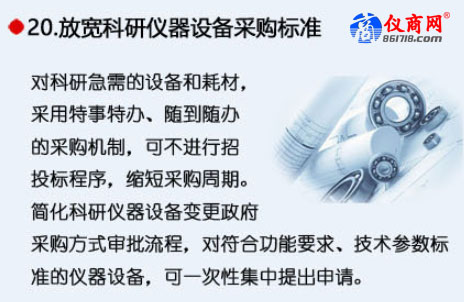 其中,在第四部分“深化科研管理改革”中,第20條明確表示“放寬科研儀器設(shè)備采購(gòu)標(biāo)準(zhǔn)”,簡(jiǎn)化科研儀器設(shè)備采購(gòu)流程,對(duì)科研急需的設(shè)備和耗材,采用特事特辦、隨到隨辦的采購(gòu)機(jī)制,可不進(jìn)行招標(biāo)程序,縮短采購(gòu)周期;對(duì)獨(dú)家代理或生產(chǎn)的儀器設(shè)備,按程序確定采取單一來源采購(gòu)等方式增強(qiáng)采購(gòu)靈活性和便利性。簡(jiǎn)化科研儀器設(shè)備變更政府采購(gòu)方式審批流程,對(duì)符合功能要求、技術(shù)參數(shù)標(biāo)準(zhǔn)的儀器設(shè)備,可一次性集中提出申請(qǐng),由主管預(yù)算單位歸集后向市財(cái)政部門申報(bào)。