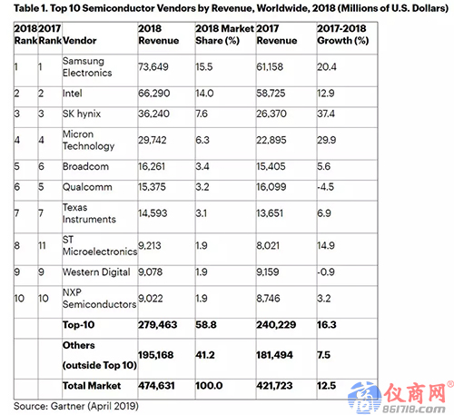 據(jù)Gartner數(shù)據(jù),2018年全球半導(dǎo)體市場規(guī)模4746.31億美元,年增12.5%,三星憑借在半導(dǎo)體市場的優(yōu)勢以營收736.49億美元居冠。半導(dǎo)體行業(yè)市場集中度很高,CR10達(dá)到58.8%,top10半導(dǎo)體公司中無中國企業(yè)。存儲器仍然是半導(dǎo)體產(chǎn)品中市場份額最大的一類產(chǎn)品,市場份額達(dá)到34.3%,目前三星電子88%的收入來自存儲器。