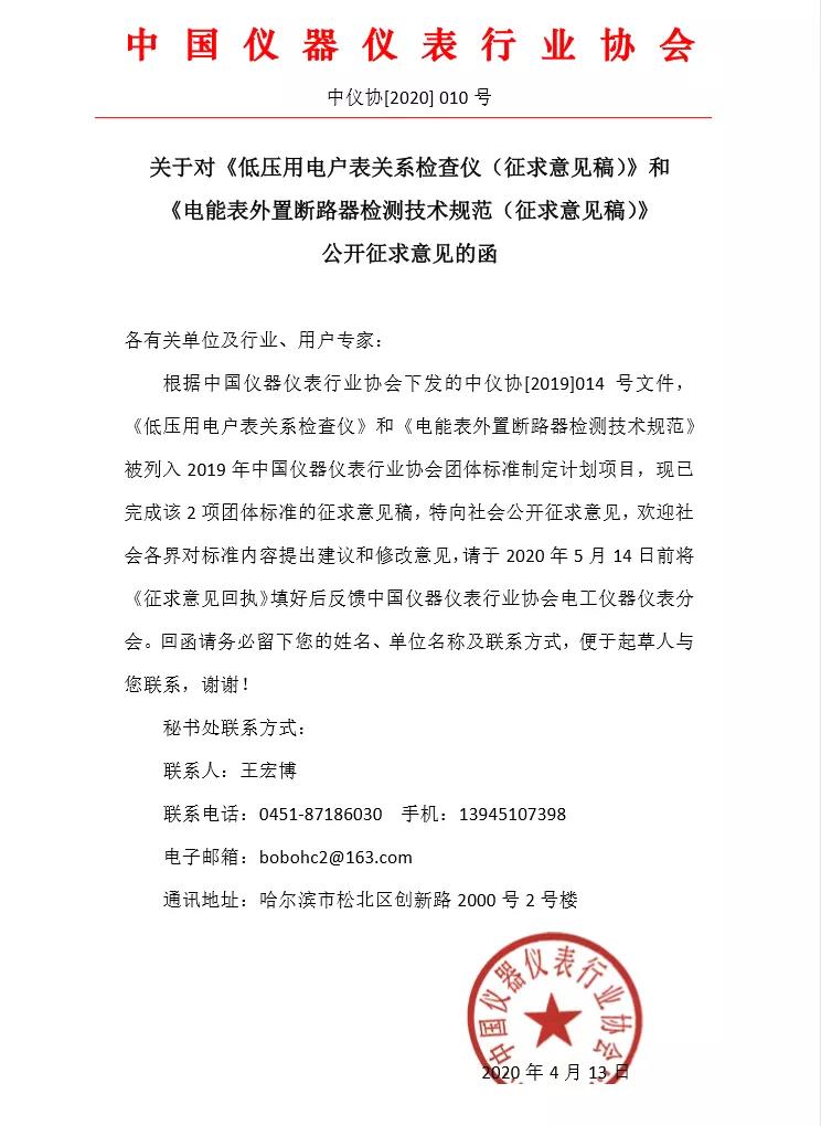 1.關(guān)于對《低壓用電戶表關(guān)系檢查儀(征求意見稿)》和《電能表外置斷路器檢測技術(shù)規(guī)范(征求意見稿)》 公開征求意見的函