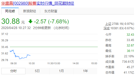 4月28日上午10點27分左右,華盛昌股票報價為30.88元,較發(fā)行價格14.89元,股價已經(jīng)翻番。