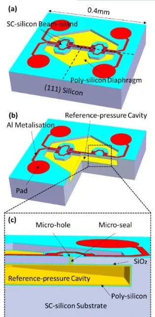 利用無疤痕微創(chuàng)手術(shù)工藝制造的絕對(duì)壓力傳感器芯片示意圖