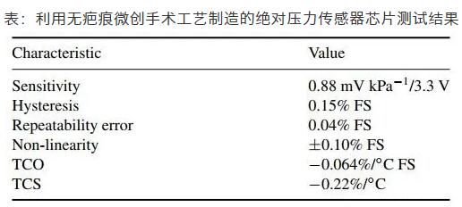 表:利用無疤痕微創(chuàng)手術(shù)工藝制造的絕對(duì)壓力傳感器芯片測(cè)試結(jié)果