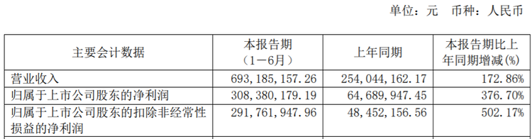 7月20日下午,睿創(chuàng)微納發(fā)布半年報顯示,上半年,公司實現(xiàn)營業(yè)收入6.93億元,較上年同期增長172.86%;實現(xiàn)營業(yè)利潤3.54億元,較上年同期增長440.16%;實現(xiàn)歸屬于母公司所有者的凈利潤3.08億元,較上年同期增長376.7%;扣非后凈利潤為2.92億元,同比增長502.17%。