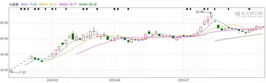 關(guān)于股票表現(xiàn)情況,2020年4月15日上市,發(fā)行價(jià)為14.89元,在2020年7月13日時(shí)最高漲至92.96元,增長(zhǎng)624%。