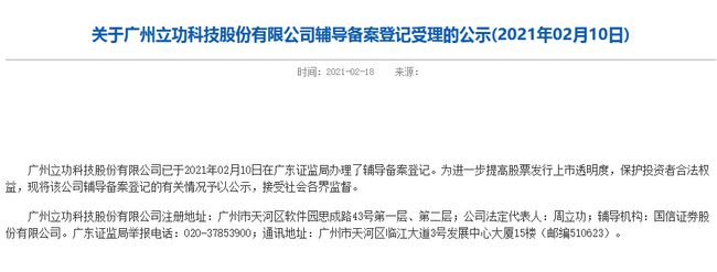 近日,廣州立功科技股份有限公司(以下簡(jiǎn)稱(chēng)“立功科技”)與國(guó)信科技再次簽署上市輔導(dǎo)協(xié)議,擬闖關(guān)A股,已于2021年02月10日在廣東證監(jiān)局辦理了輔導(dǎo)備案登記。