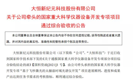 近日,大恒新紀(jì)元科技股份有限公司(以下簡(jiǎn)稱“大恒科技”)發(fā)布公告稱,由該公司牽頭承擔(dān)的國家重大科學(xué)儀器開發(fā)專項(xiàng)“基于飛秒激光的太赫茲時(shí)域光譜儀開發(fā)”項(xiàng)目進(jìn)展順利,進(jìn)度和成果產(chǎn)出達(dá)到任務(wù)書要求的考核指標(biāo),順利通過綜合驗(yàn)收。