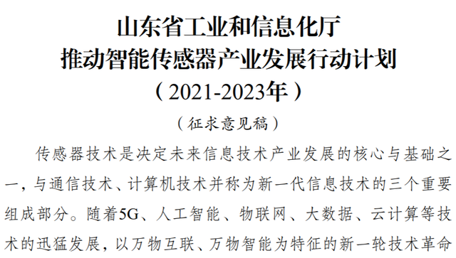 近日,記者從山東省工信廳獲悉,《山東省工業(yè)和信息化廳推動智能傳感器產(chǎn)業(yè)發(fā)展行動計(jì)劃(2021-2023年)》開始征求意見,其中規(guī)劃,到2023年全省智能傳感器主營業(yè)務(wù)收入達(dá)到300億元。做大做強(qiáng)一批智能傳感器設(shè)計(jì)、制造、封測和系統(tǒng)集成的龍頭骨干企業(yè),帶動形成千億級產(chǎn)業(yè)規(guī)模。