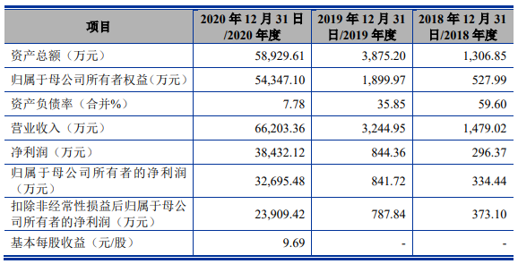 2018-2020年,燁映微實(shí)現(xiàn)營業(yè)收入分別為1479.02萬元、3244.95萬元、66203.36萬元;對應(yīng)的凈利潤分別為296.37萬元、844.36萬元、38432.12萬元。無論是營收還是凈利潤,均實(shí)現(xiàn)翻倍增長。