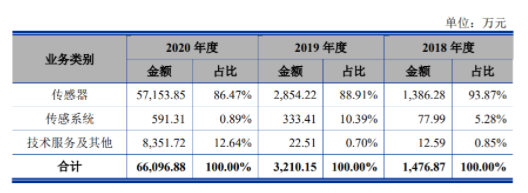 招股書顯示,2020年燁映微營收、凈利潤暴增的原因主要系當(dāng)年公司傳感器產(chǎn)品實(shí)現(xiàn)巨額收入,由2018年的1386.28萬元拉升至2020年的5.72億元,漲幅達(dá)到3985.71%,其中,報(bào)告期內(nèi),公司紅外熱電堆傳感器出貨量不斷攀升,從2018年的439.16 萬個(gè)增長到2020年的6737.79萬個(gè),復(fù)合增長率達(dá)到291.69%。