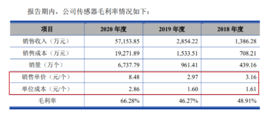 不難發(fā)現(xiàn),2020年公司傳感器毛利率大幅上漲系銷售單價(jià)增幅遠(yuǎn)超過成本增幅所致。
