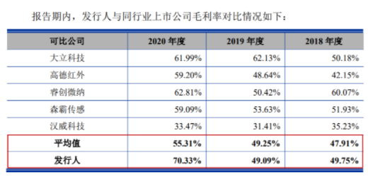 報(bào)告期內(nèi),公司傳感器產(chǎn)品的毛利率分別為48.91%、46.27%和66.28%。2018年-2019年該產(chǎn)品毛利保持相對(duì)穩(wěn)定,而2020年毛利率上升至66.28%,同比上漲20.01個(gè)百分點(diǎn)。