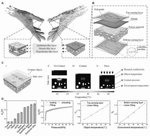 針對以上問題,朱榮團(tuán)隊提出一種基于熱感應(yīng)的多維傳感新機(jī)理,利用熱敏膜和外界的傳導(dǎo)/對流換熱對自身電阻的調(diào)控,實現(xiàn)了壓力、溫度、流場、熱物性等參數(shù)的集成測量。由于采用簡單的薄膜敏感結(jié)構(gòu)和統(tǒng)一的熱敏檢測原理,這種柔性電子器件具有結(jié)構(gòu)簡單、集成度高、低交叉耦合、易調(diào)控、成本低等特點。
