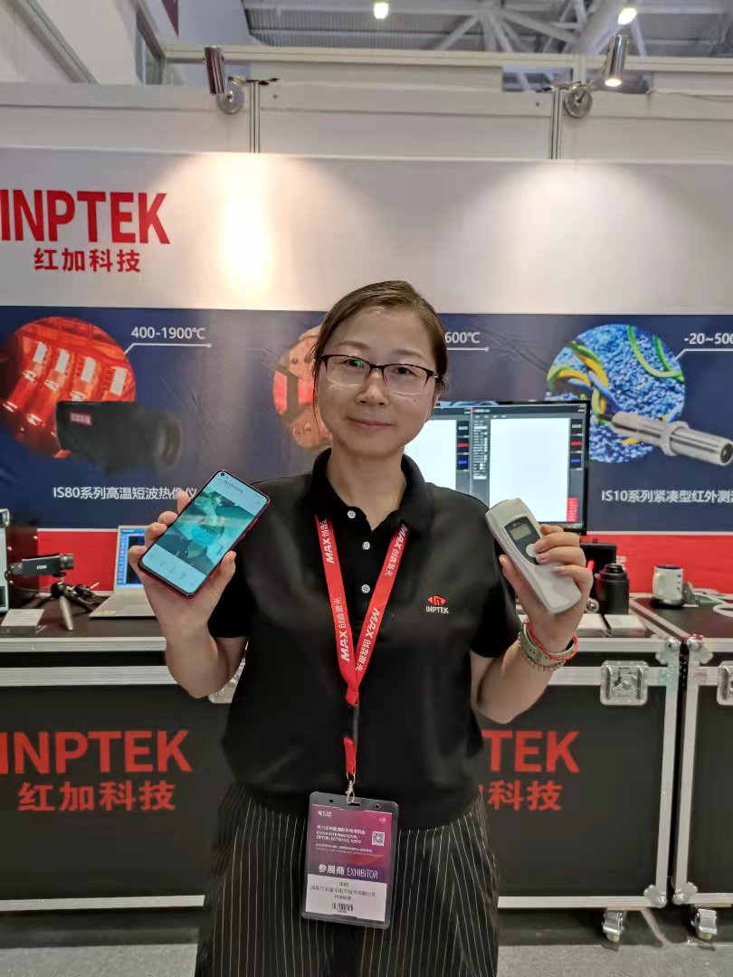 (歐普士市場經(jīng)理朱妮展示IP15系列便攜式紅外測溫儀)