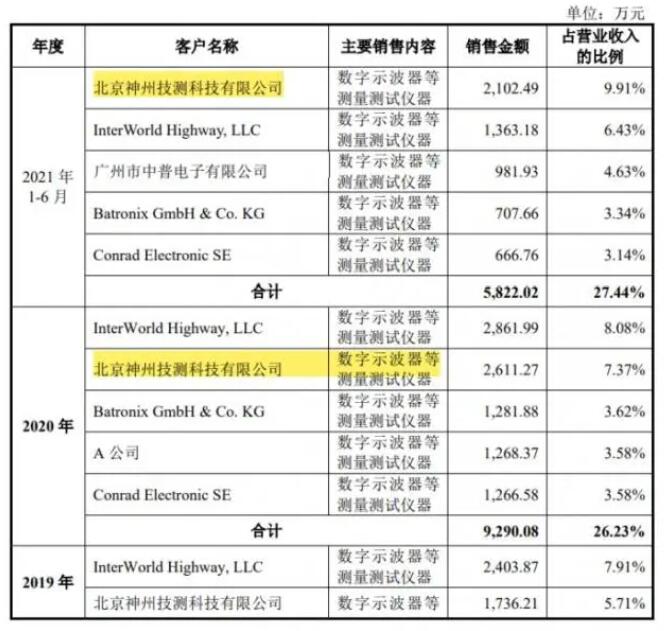 21世紀經(jīng)濟報道記者查閱工商信息發(fā)現(xiàn),普源精電確實曾是神州技測的股東之一,曾持股15%,2012年退出股東序列。2018年至2020年,神州技測始終是普源精電的第二大客戶,銷售額分別為1875.40萬元、1736.21萬元、2611.27萬元,今年上半年成為公司第一大客戶,銷售額達2102.49萬元,成為普源精電近年來唯一個銷售大幅增長的前五大客戶。2020年,普源精電的營收增長額幾乎20%是神州技測貢獻。