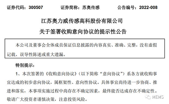 2月7日,江蘇奧力威傳感高科股份有限公司(簡稱:蘇奧傳感)發(fā)布《關于簽署收購意向協(xié)議的提示性公告》:擬以現(xiàn)金方式收購MEMS傳感器廠商——龍微科技無錫有限公司(簡稱:龍微科技)的股權(合計不少于42%),本次交易完成后,龍微科技將成為蘇奧傳感的控股子公司。