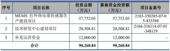 MEMS紅外熱電堆傳感器廠商燁映微電子本次計(jì)劃募資的9億元主要用途:5.78億元用于MEMS紅外熱電堆傳感器生產(chǎn)建設(shè)項(xiàng)目,2.05億元用于技術(shù)研發(fā)中心建設(shè)項(xiàng)目,1.2億元用于補(bǔ)充運(yùn)營(yíng)資金。