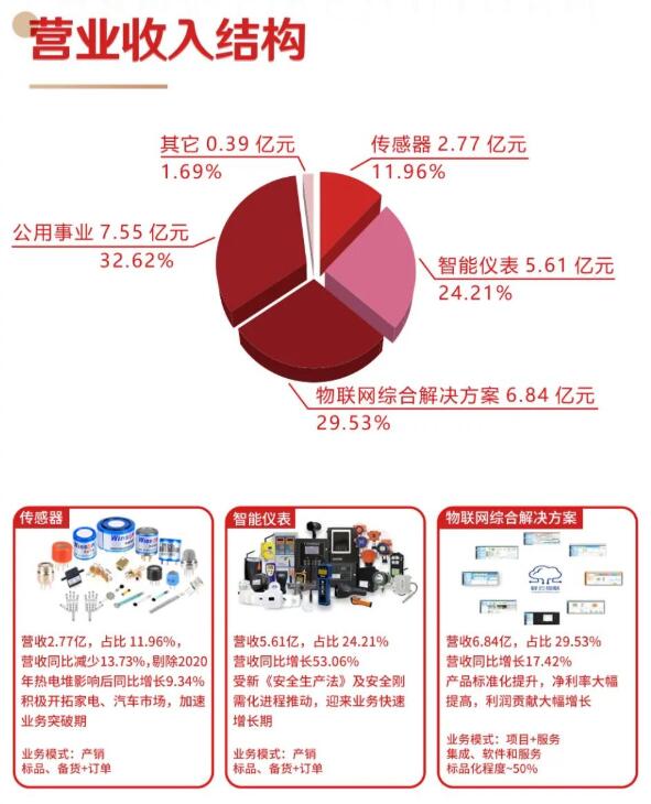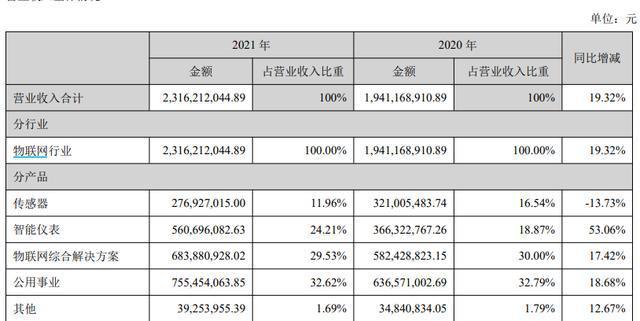 報告期內(nèi),分行業(yè)來看,漢威科技傳感器產(chǎn)品營收2.77億元,占比11.96%。智能儀表產(chǎn)品營收5.6億元,占比24.21%,較2020年同期(營收3.66億元)增長53.06%,是漢威科技2021年業(yè)務(wù)增長最快的板塊。