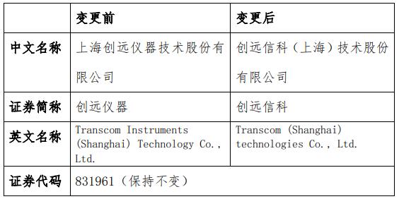 創(chuàng)遠(yuǎn)儀器表示,公司原“創(chuàng)遠(yuǎn)儀器”的內(nèi)涵及定位已無法充分而全面涵蓋公司業(yè)務(wù)情況及發(fā)展領(lǐng)域,公司名稱變更為創(chuàng)遠(yuǎn)信科(上海)技術(shù)股份有限公司能夠更加體現(xiàn)產(chǎn)品的核心技術(shù)。