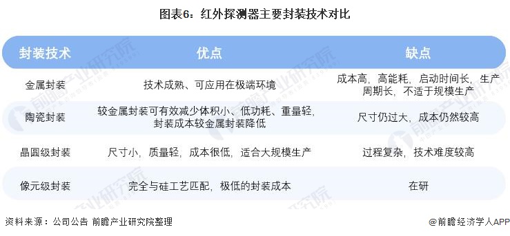 紅外探測(cè)器三種主要的封裝類型:金屬、陶瓷、晶圓級(jí)。封裝成本占到探測(cè)器成本的30%-50%以上,封裝技術(shù)很大程度上決定了探測(cè)器的性能和成本。目前行業(yè)內(nèi)封裝技術(shù)正從芯片級(jí)(金屬、陶瓷)向晶圓級(jí)、像元級(jí)發(fā)展,晶圓級(jí)封裝難度大,但集成效果好,可將封裝成本從千元降低至百元的數(shù)量級(jí),像元級(jí)仍在研究當(dāng)中。