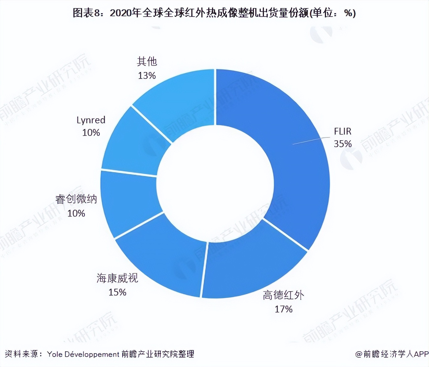 中國(guó)紅外企業(yè)出貨量持續(xù)提升,2020年受疫情影響尤其明顯。Yole Développement調(diào)研報(bào)告顯示,在2020年的全球紅外熱成像整機(jī)出貨量上,F(xiàn)LIR出貨量占比為35%排名第一,高德紅外以17%的占比位居第二。睿創(chuàng)微納以10%的占比排名全球第四。