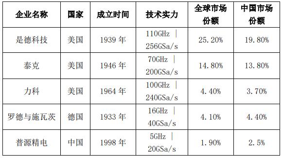 答:依據(jù)權(quán)威機構(gòu)Frost&Sullivan《全球和中國電子測量儀器行業(yè)獨立市場研究報告》,普源精電目前排名全球示波器市場第五,也是排名前五唯一的中國企業(yè)。排名前五公司對比如下: