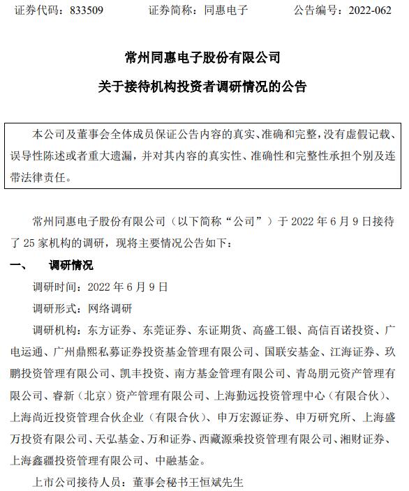 公告顯示,常州同惠電子股份有限公司 ( 以下簡(jiǎn)稱 " 公司 " ) 于 2022 年 6 月 9 日接待了 25 家機(jī)構(gòu)的調(diào)研,分別是東方證券、東莞證券、東證期貨、高盛工銀、高信百諾投資、廣電運(yùn)通、廣州鼎熙私募證券投資基金管理有限公司、國(guó)聯(lián)安基金、江海證券、玖鵬投資管理有限公司等。
