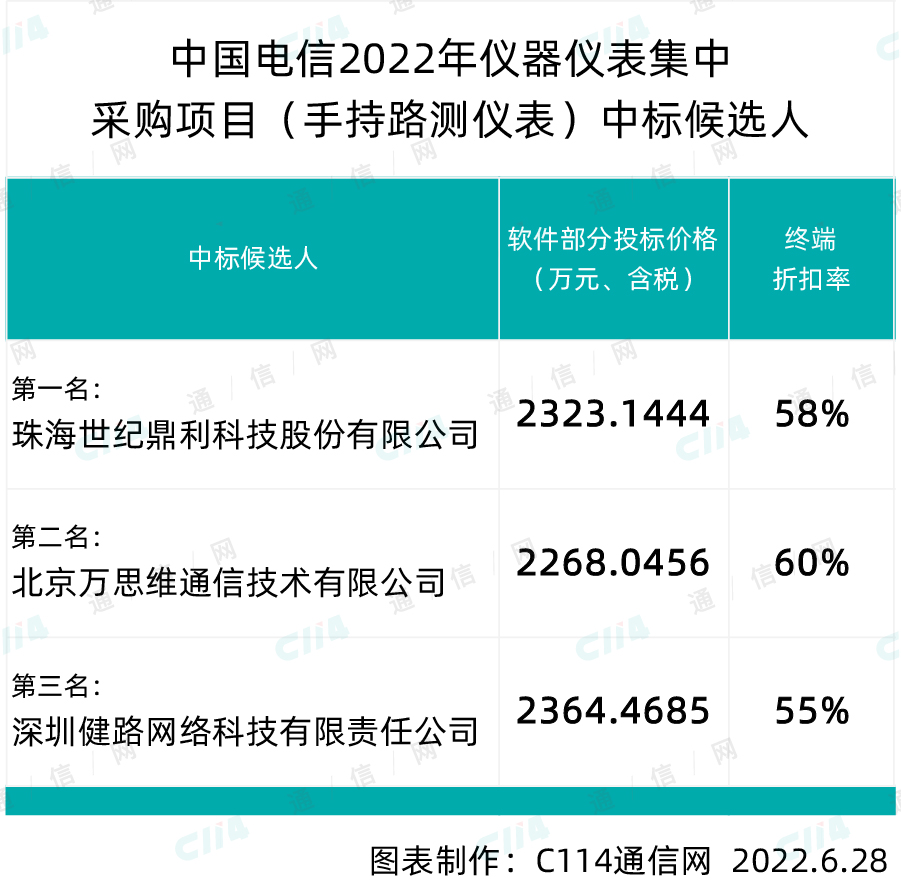 6月28日消息(焦焦)從中國(guó)電信官網(wǎng)獲悉,中國(guó)電信已于日前公示了2022年儀器儀表集中采購(gòu)項(xiàng)目(手持路測(cè)儀表)的中標(biāo)候選人,世紀(jì)鼎利、萬(wàn)思維和健路網(wǎng)絡(luò)3家入圍。